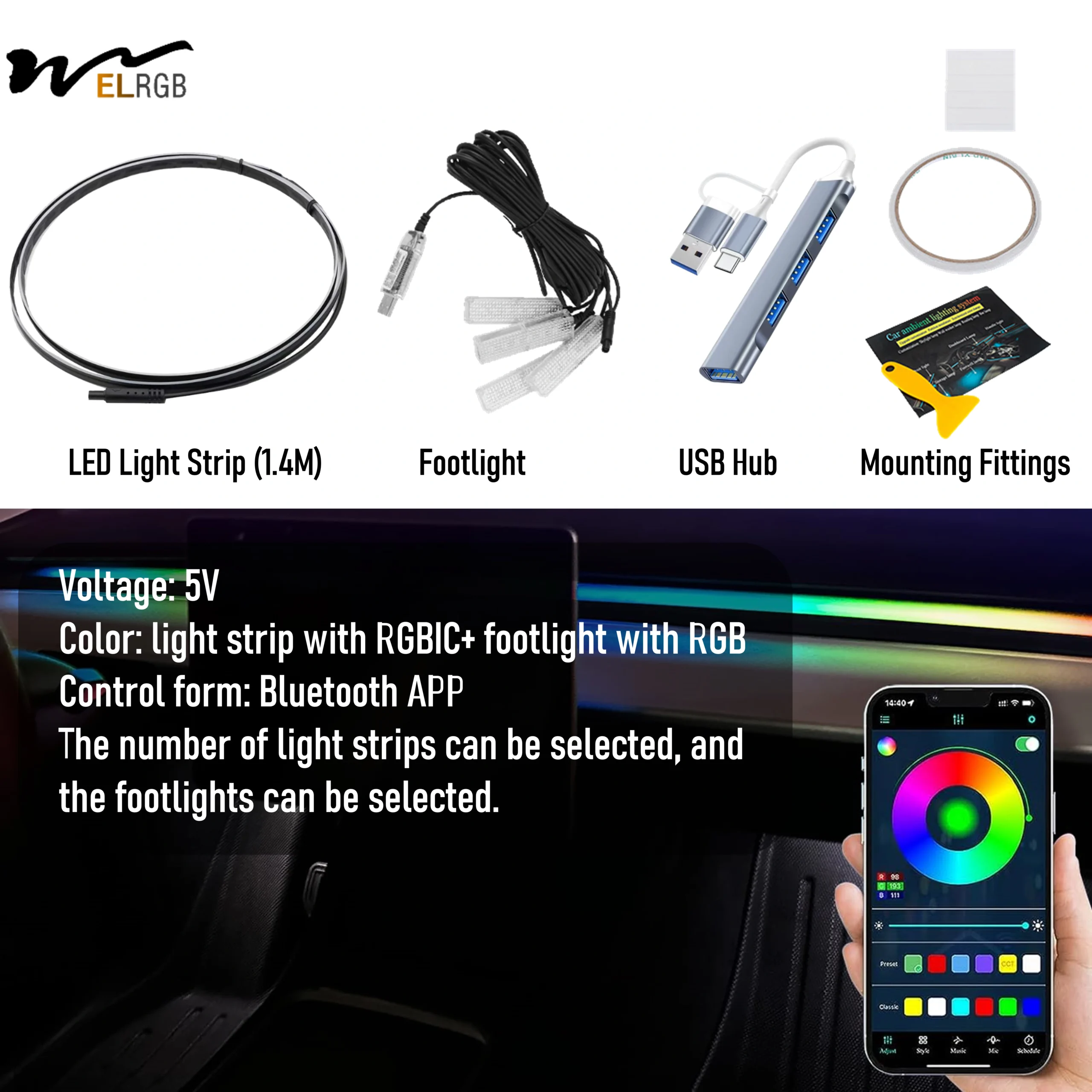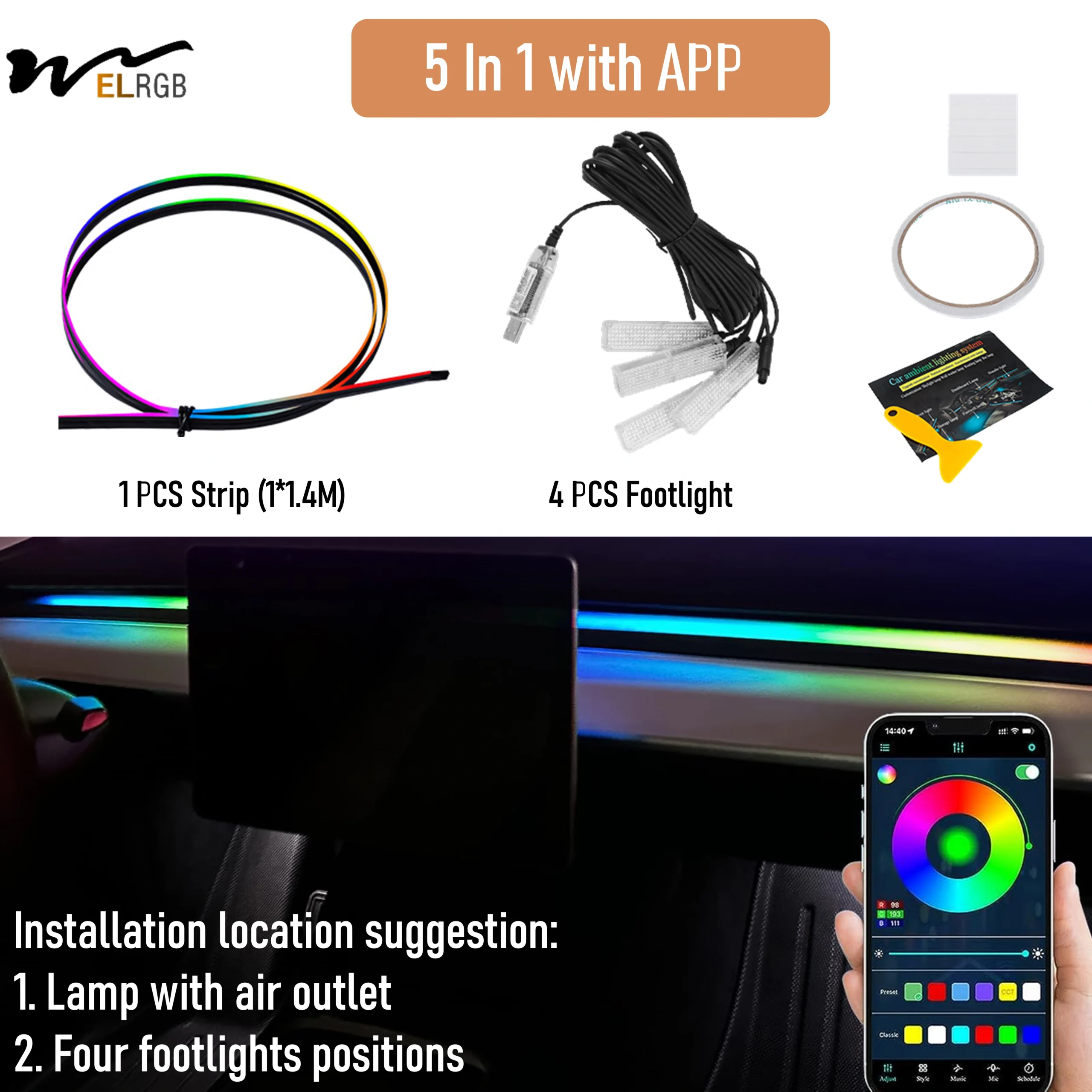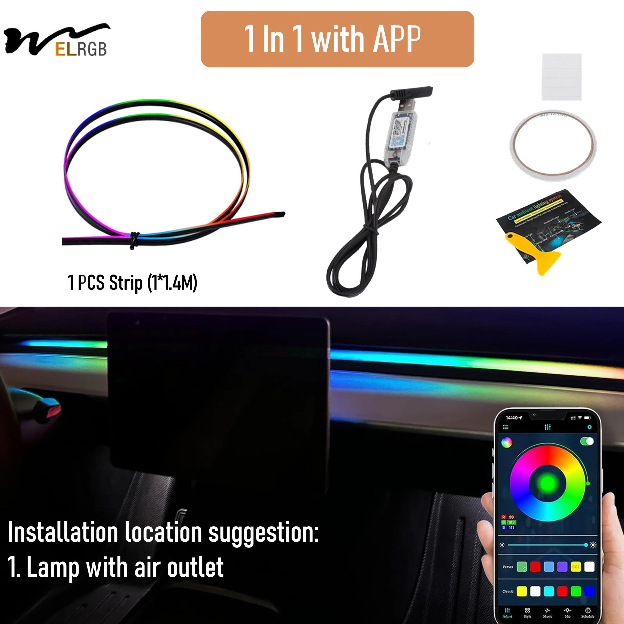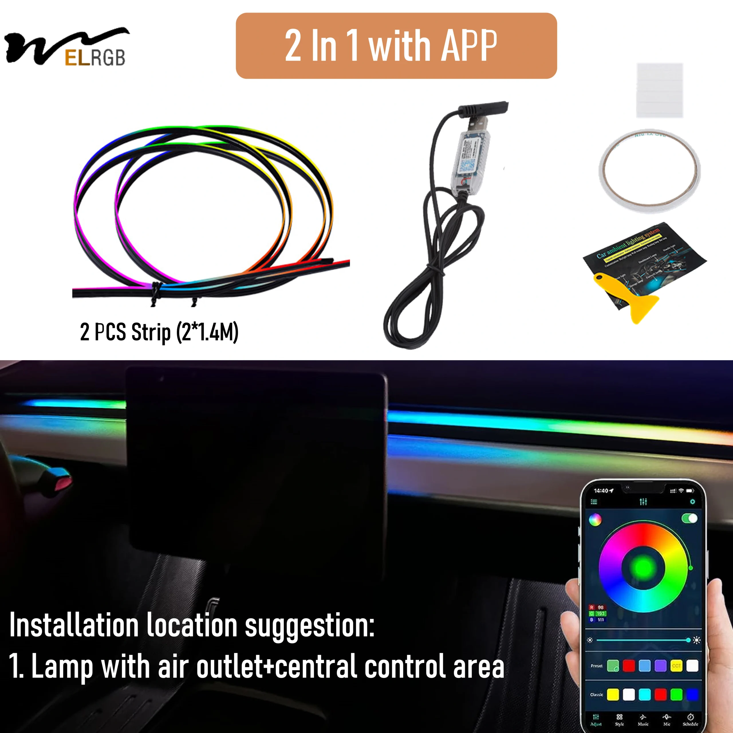 Tesla Model 3/Y Smart RGBIC Dashboard Strip Lights Waterproof Flexible LED Strip Ambient Lighting with App Control USB Interface